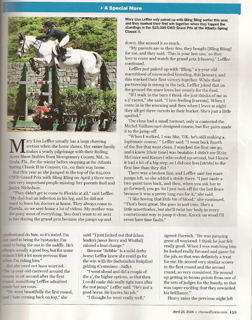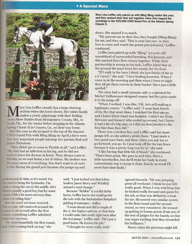 -Mary Lisa Leffler and Bling bling were 4th in the $25,000 Johnson Horse Transport Grand Prix and were 2nd in the Open Welcome Stake
